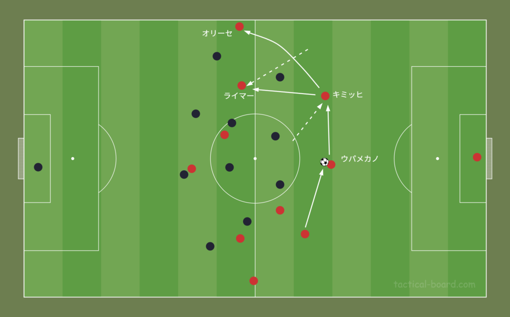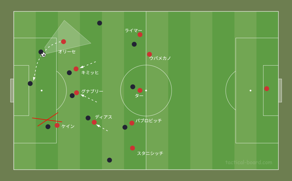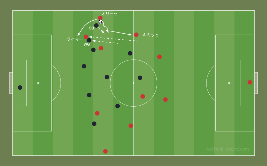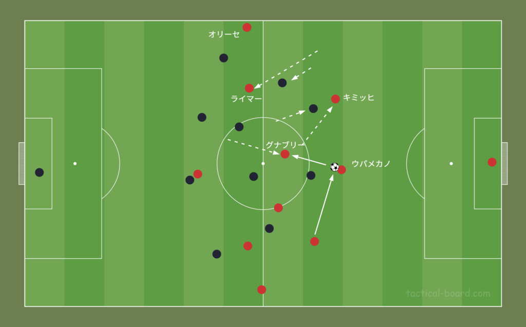 そして、そこから一気に逆サイドのオリーセにサイドチェンジする。この一連のプレーにより、ドルトムントのプレスを回避して押し込むことに成功している。
