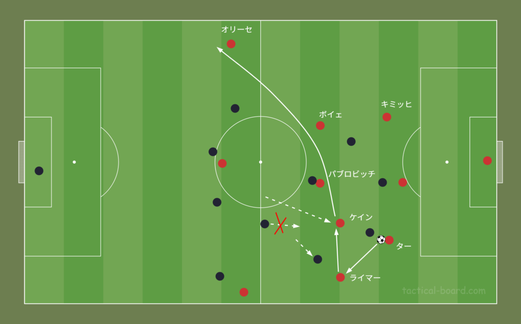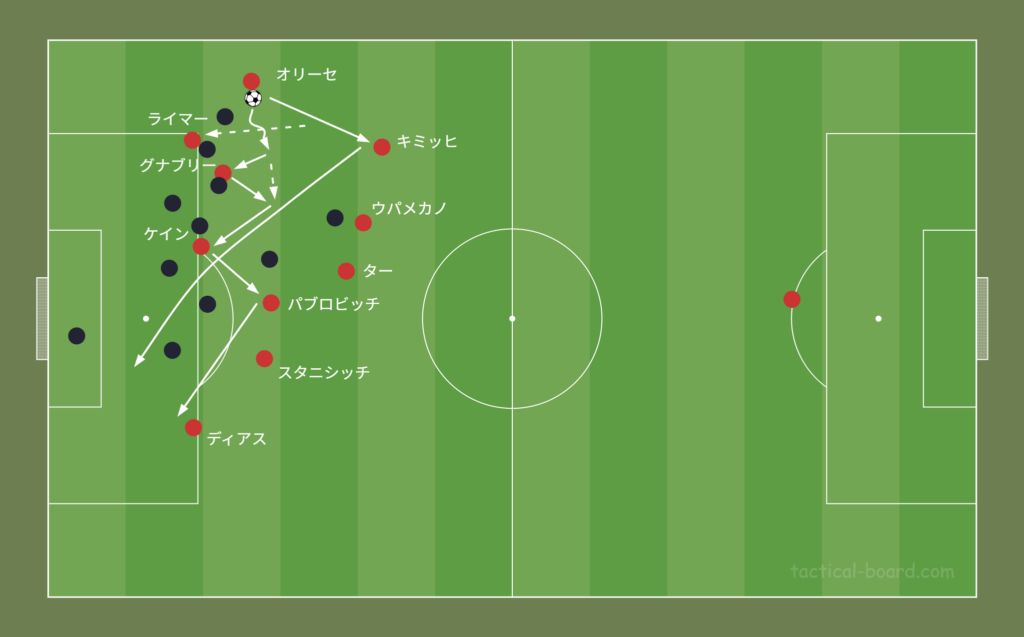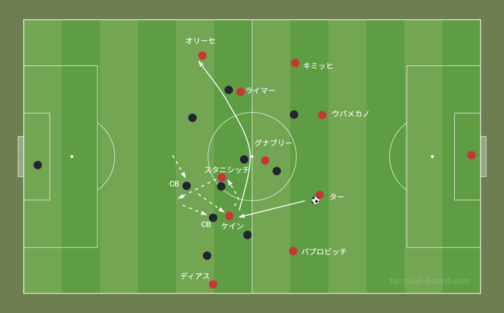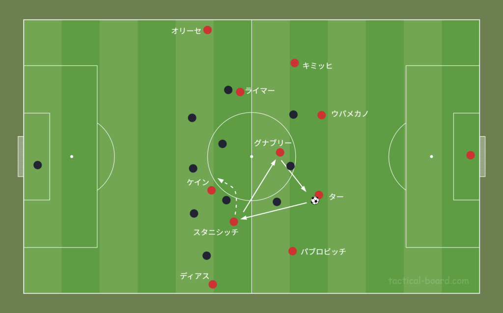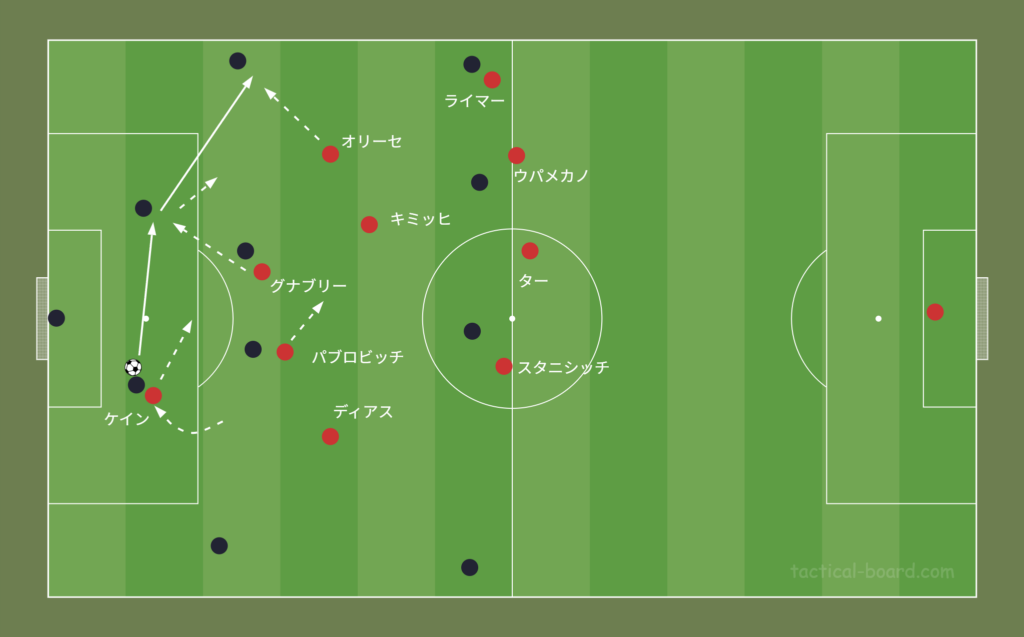 動画の冒頭で紹介したシーンは、ここまで紹介してきた連動から生まれている。ライマーとスタニシッチが絞り、キミッヒとパブロビッチがそれぞれCBとWGのリンク役となる。空いた中央にはトップ下のグナブリーが降りて前進のヘルプに入る。ボールを受けたスタニシッチがグナブリーに落としたあと、さらに中央に向かって抜け、空いたスペースにCFのケインが降りて行く。