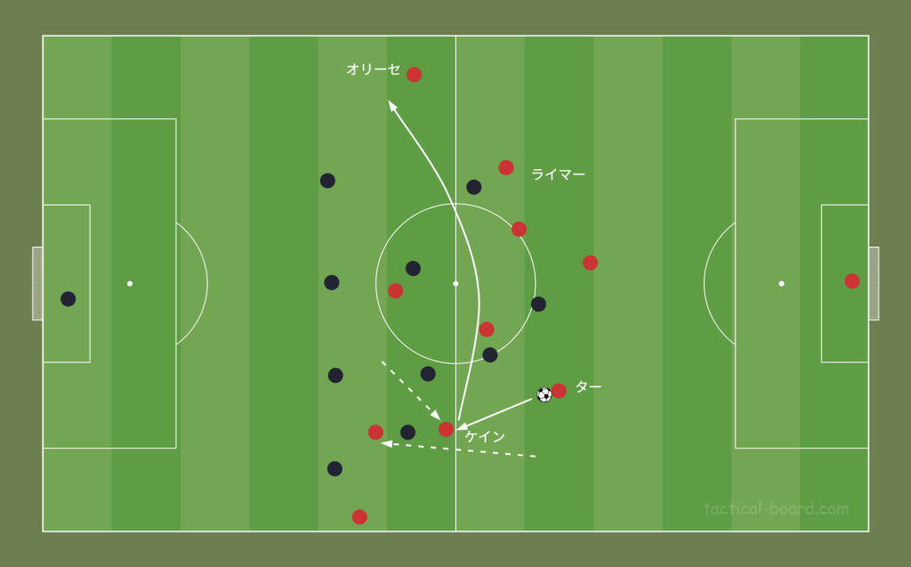 対して、チェルシーは逆サイドのCBが絞ってカバーに入る。ケインが逆サイドのオリーセにサイドチェンジをすると、インサイドで構えていたライマーが、大きく空いたチャンネルに抜け出して決定機を迎えることとなった。