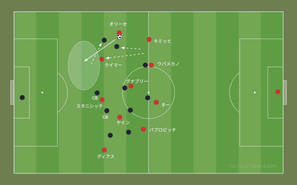 また、スタニシッチはスピードのあるタイプでもなく、サイドでの守備に怪しい部分が見られる。WGのディアスが受け渡しをせずに低い位置まで戻る等、連携も取れていない。