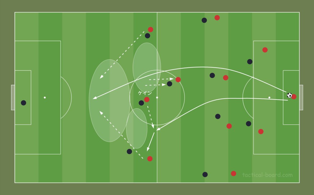 トップ下のグナブリーは低い位置で中盤のサポートを行い、CFのケインは0トップとなり、良い意味でゴール前から消えるケースが多くなった。