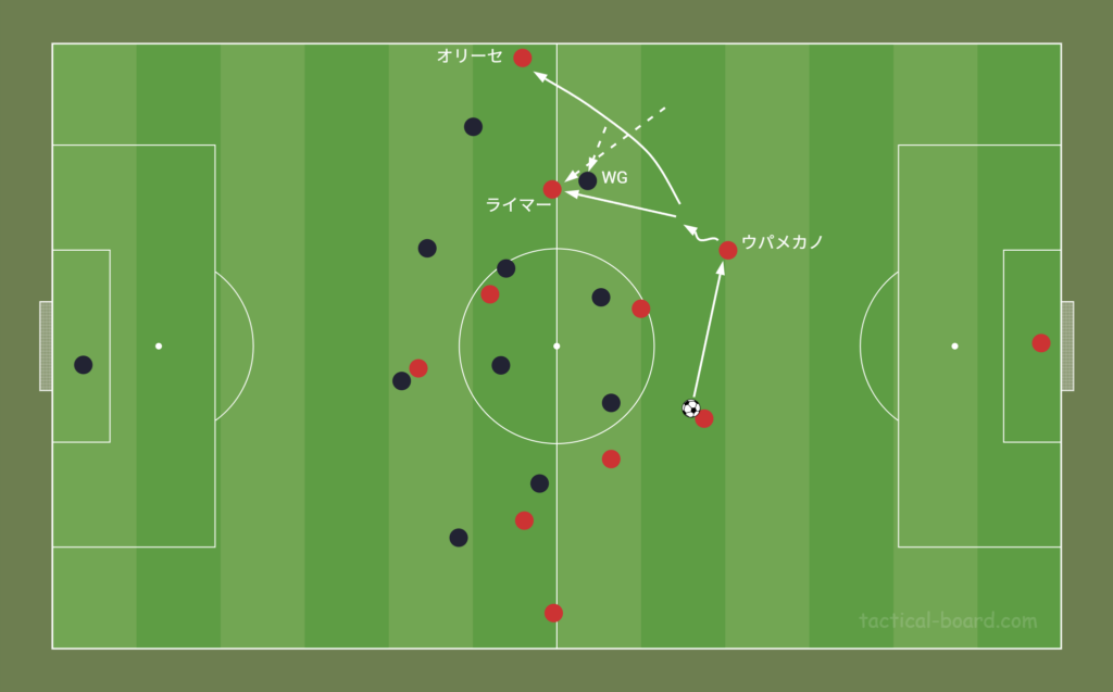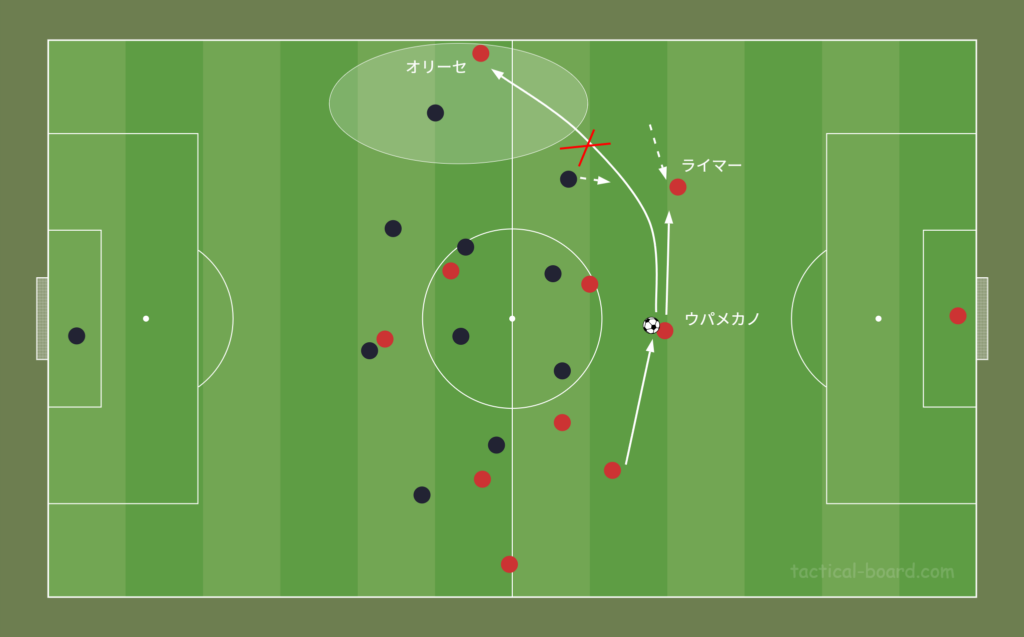 サイドチェンジを受けるオリーセは、敵の中盤ラインを越えた位置で、かつDFラインの手前。サイドチェンジを受けた後のDFとの間合いを確保できるギリギリ内側に立つ。そうすることで、幅を取りつつよりゴール近くで勝負に出るという選択肢を相手に見せ、脅威を与えている。