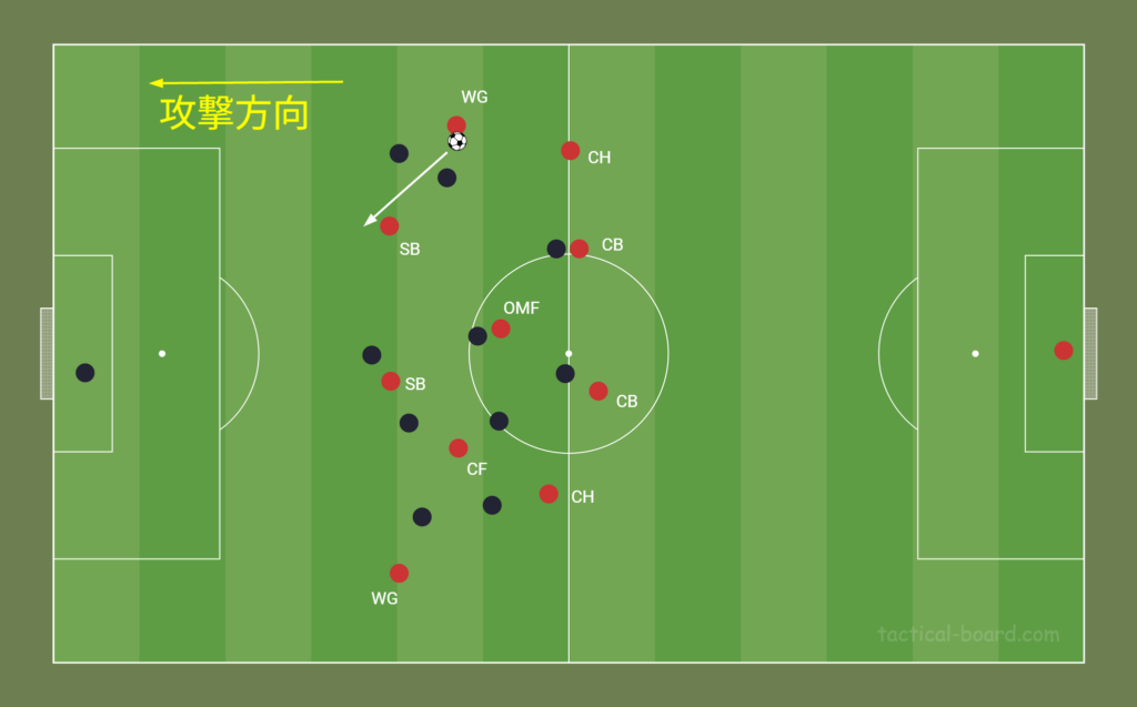WGが中に絞るのはボールを捌いた後になる。WGがボールを受けると、SBが必ずチャンネルを突くランニングを入れる。サイドチェンジとセットであればチャンネルが空きやすくなるため、一撃必殺の連携技となる。