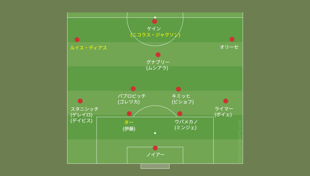 バックアップとして、チェルシーからニコラス・ジャクソンをローンで獲得している。ただし、サネ、ミュラー、コマンが退団したことで、自慢であった2列目の選手層が急激に薄くなっている。