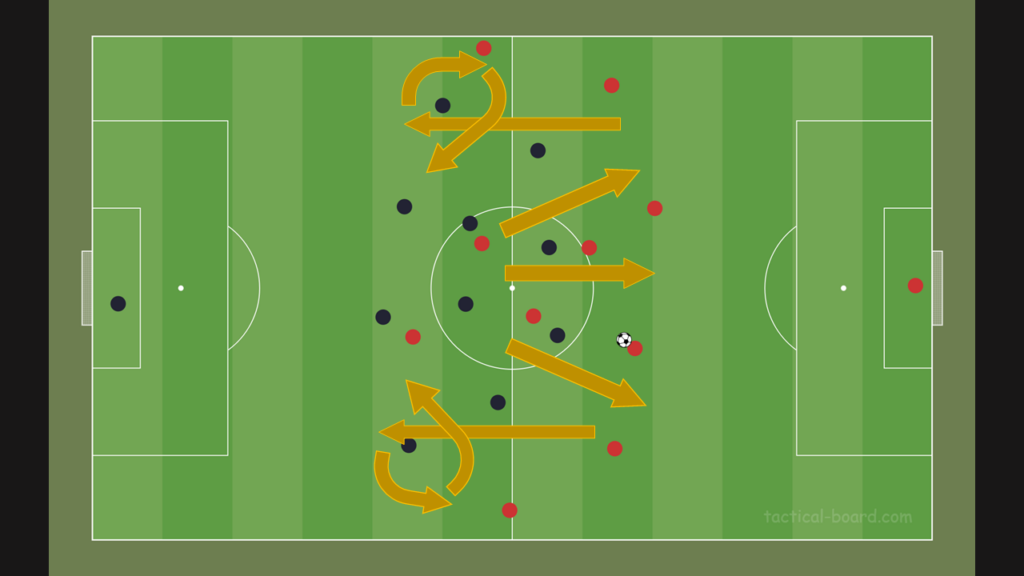 逆サイドへボールが展開される場合も、外切りのスライドが間に合わないため中切りでプレスをかけにいく。